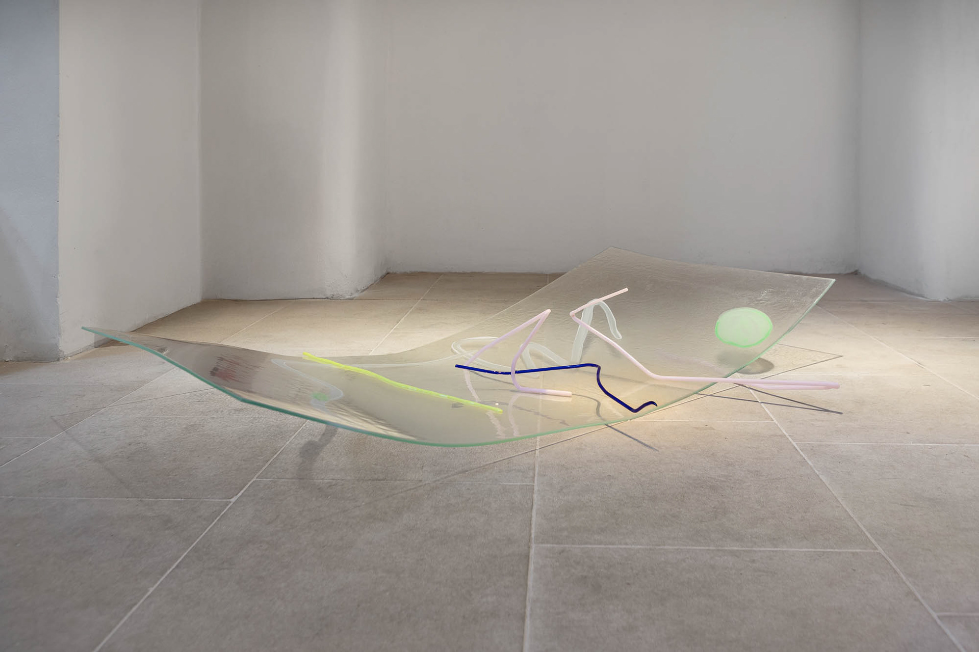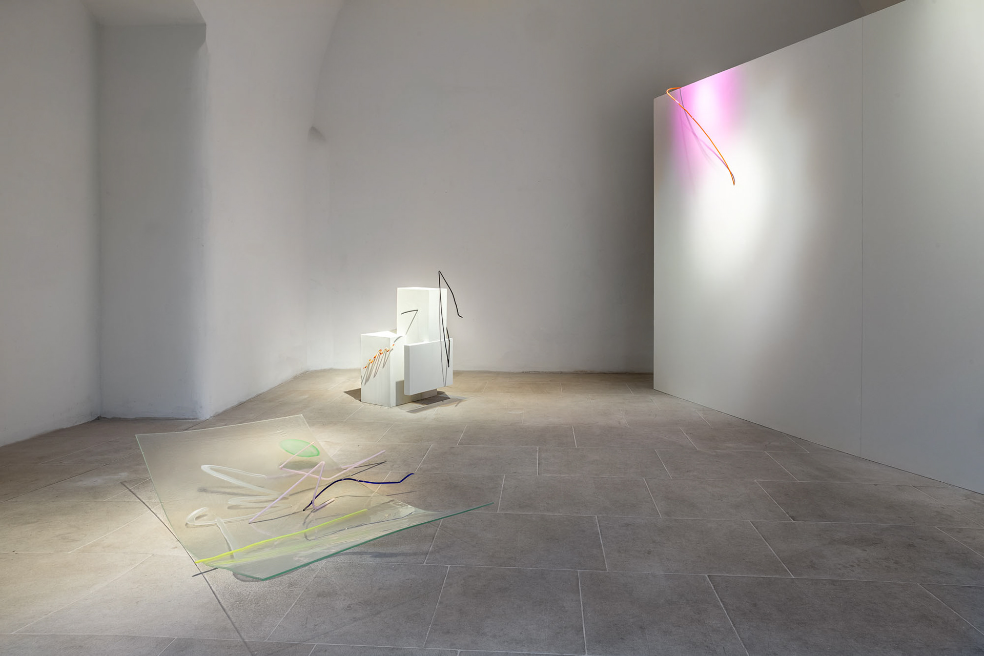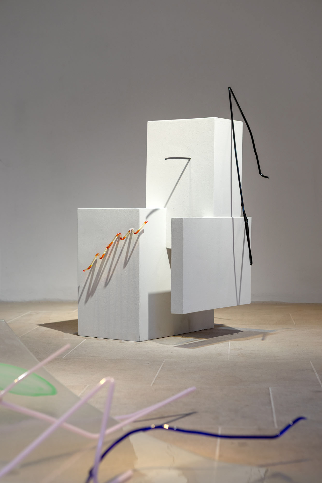 The exhibition Beyond Format presents the current work of glass artist Pavlína Šváchová, emphasizing the dialogue between drawing, glass, matter, space, and movement. It is based on experimental research into the possibilities of lampwork glass, its malleability, and its expressive potential, which transcends the plane of two-dimensional drawing into a glass object. A key element of the exhibition is the glass rod — a simplified, pure bearer of line, the distilled essence of drawing. It leaves the medium of drawing and enters space as a material drawing that becomes an object. Its mass carries fragility, tension, and resistance, while remaining in constant dialogue with the body, movement, color, and light. Drawing here is not just the result of a gestural record, but a form of thinking in matter, connecting craftsmanship, design aesthetics, and the principles of contemporary intermedia art. The curatorial approach emphasizes the themes of lines, bodies, and their movement in space. Drawing is conceived as a process — sometimes pointillist, sometimes linear, often scattered or concentrated in a single object. The architecture of the exhibition plays a key role, based on the specifics of the given space and determining the rhythm of the installation, the orientation of the objects, and the play of light and shadow. A glass rod — an object placed on a panel, on slumped glass, or on cement blocks — accentuates the surface, point, and line — drawing in its elementary form. Slumped glass then shows the possibilities of the material's malleability in the tension between the technical challenge and the poetics of the resulting form. Each point of contact between the glass and another surface raises the question of relationship: what happens when a drawing becomes spatial, glass matter becomes lines, and shadow becomes image? Shadow is also an important element of the installation, extending the physical dimension of the object by another plane of perception – optical, psychological, and temporal. The projected image of a glass line becomes an ephemeral drawing that exists only in a given moment of light. Beyond Format is not only the title of the exhibition, but also a call to transcend the boundaries of traditional disciplines – to explore drawing as a living, space-time process and an intermedia language of contemporary art, realized through the medium of glass. curator: Lenka Sýkorová