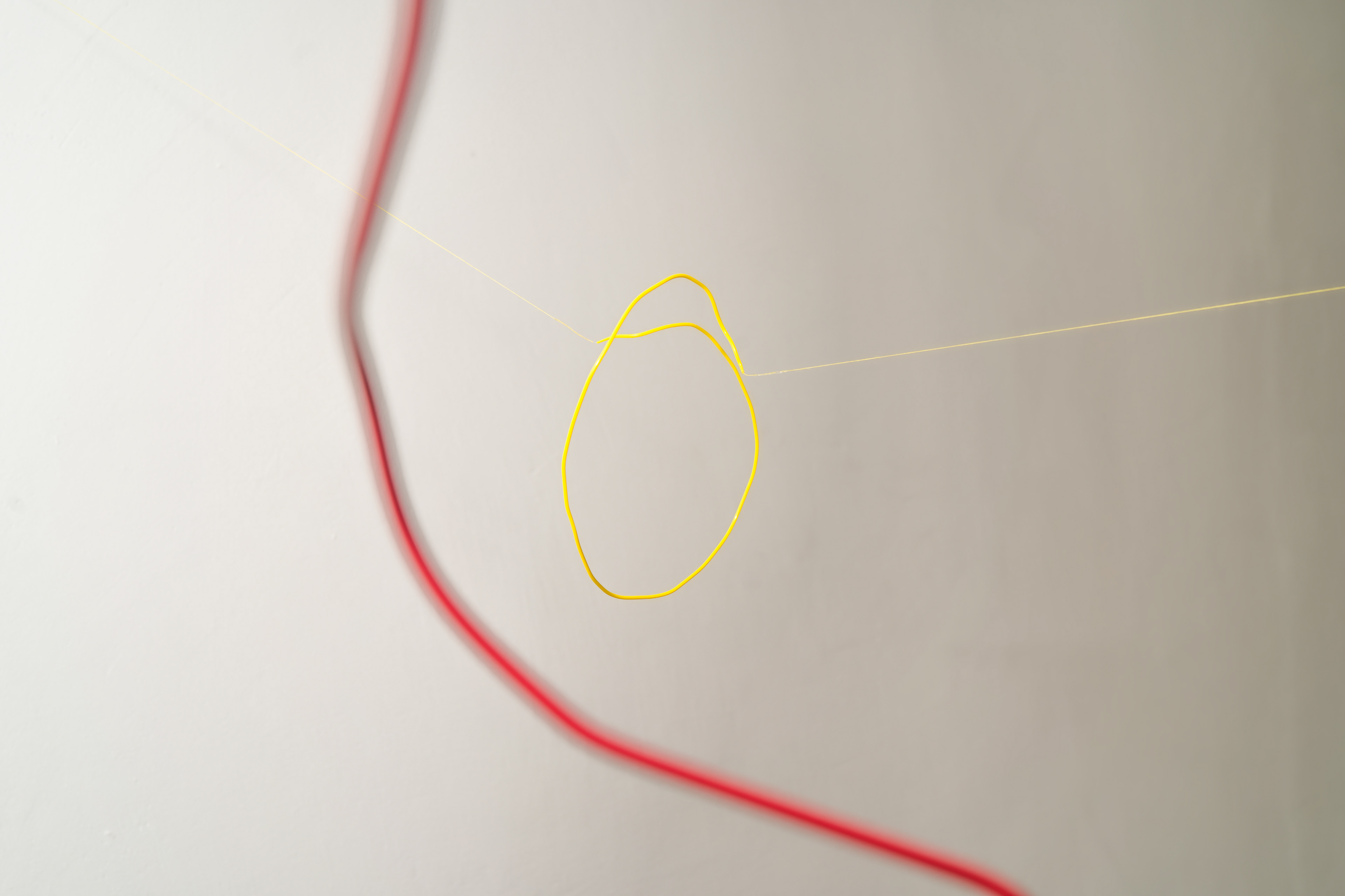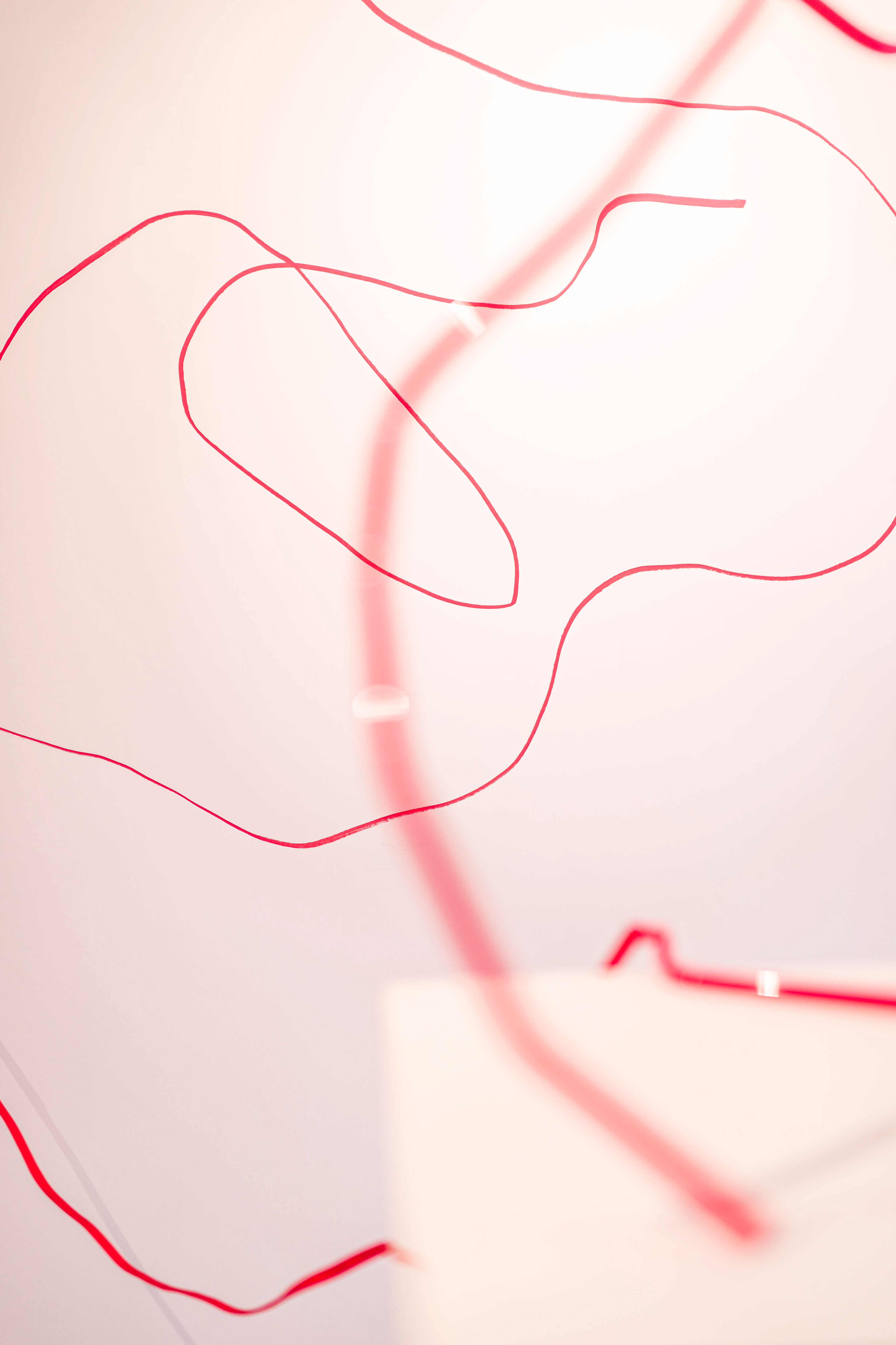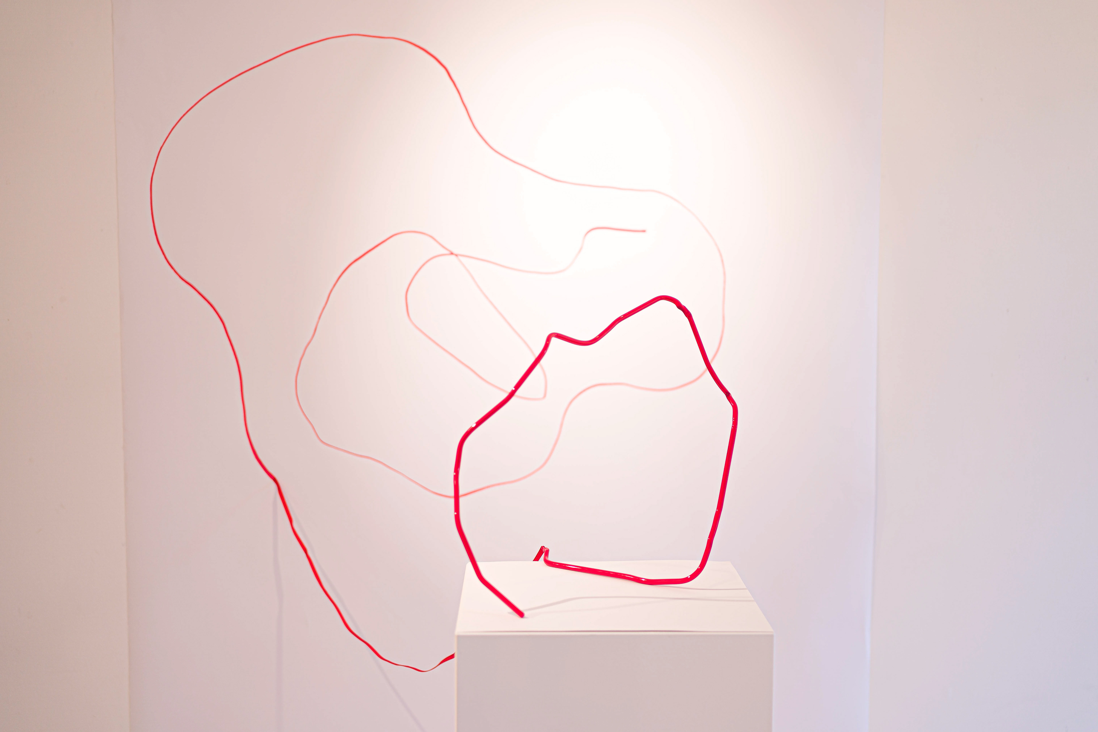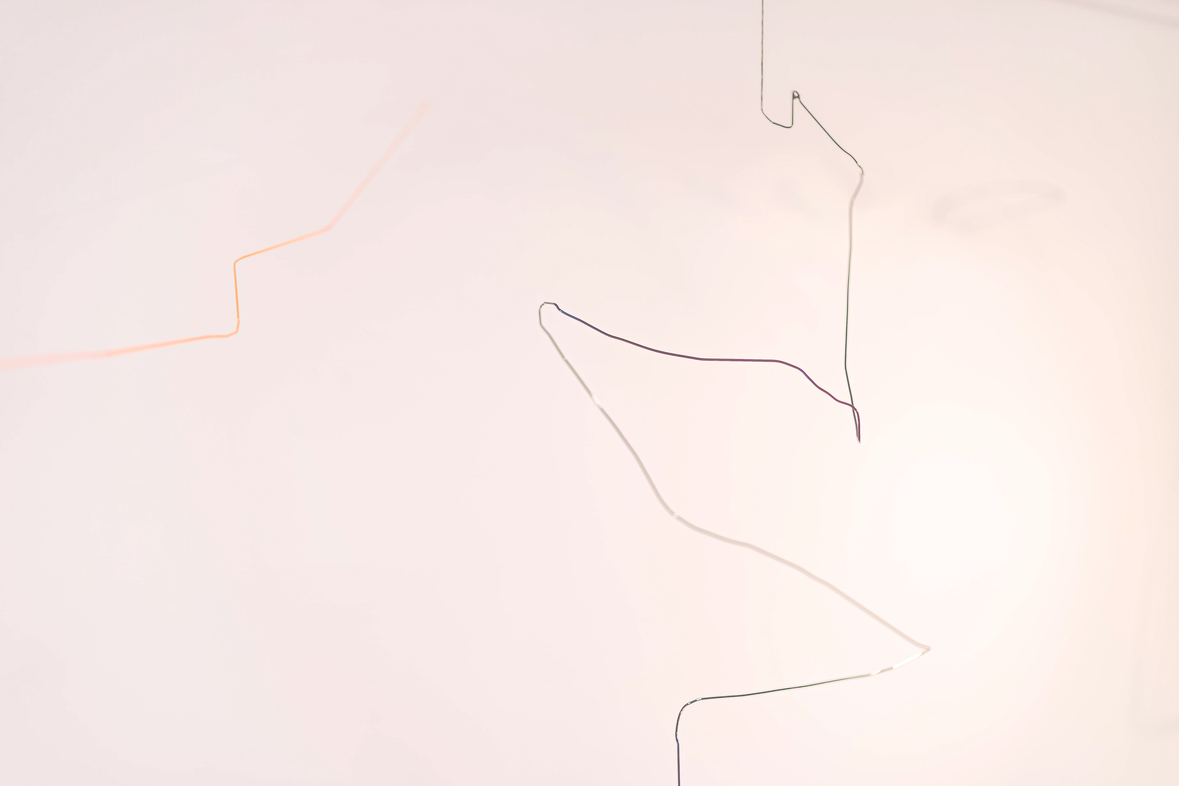 Výchozí materiál techniky lampového skla – skleněná tyčinka – v této práci chápána jako linie či čára, která se působením tepla formuje do prostorové struktury (materializované kresby). Vlastnosti materiálu a technologie se stávají omezením i předmětem experimentu, který zkoumá a prověřuje možnosti lampového skla. Práce otevírá otázky o prostoru, hmotě, ale i o samotné technologii a autonomii lampového skla v nových souvislostech.